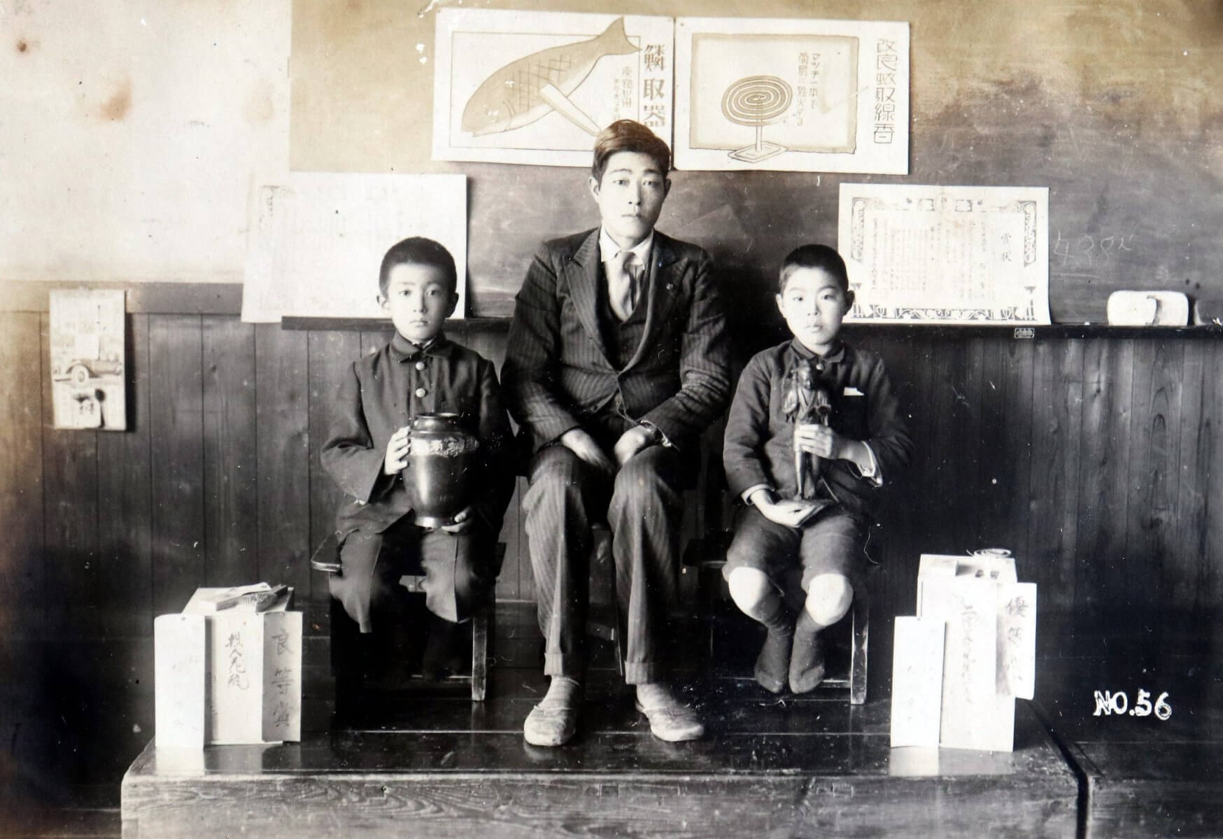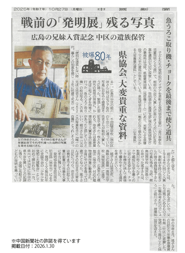 「小国民創案表彰展覧会(現:広島県児童生徒発明くふう展(全日本学生児童発明くふう展)」が開催されていたと思われる。全国に先駆けて子どもの発明を募っていた 写真は入賞を記念して撮影したとみられる写真。左は故・細川 浩史さん。壁には「鱗取器」とある(写真提供:細川 洋 様) 細川 浩史さんの妹、故