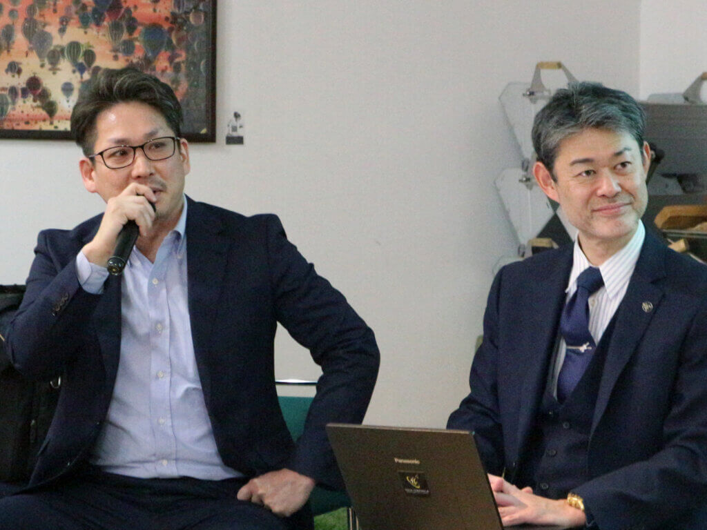 本事業発案者である特許庁・高田氏と、連携提案のテクニカル部分を担う (株)テックコンシリエ・鈴木氏、本事業に参加した2社をお招きして、 参加企業の視点や感想を伺いながら約1時間、[連携シナリオの仕組み]についてセッションしていただきました。