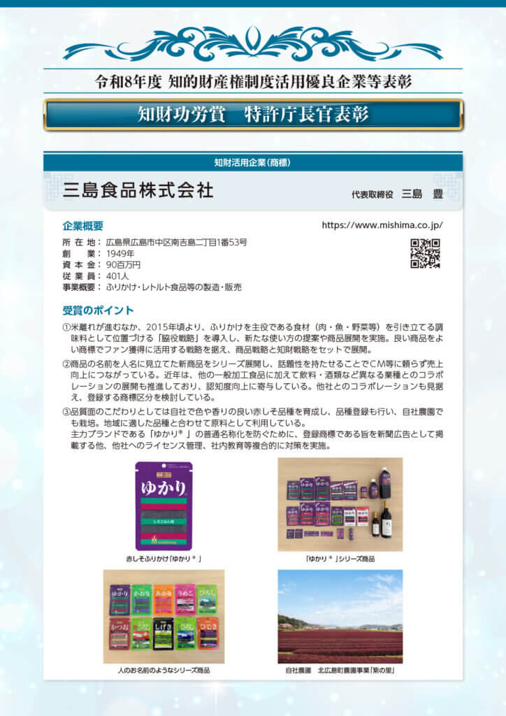 このたび、当協会の会員企業である三島食品株式会社が、令和8年度 知的財産権制度活用優良企業等表彰で、知財功労賞 特許庁長官表彰を受彰されることが決定しました。