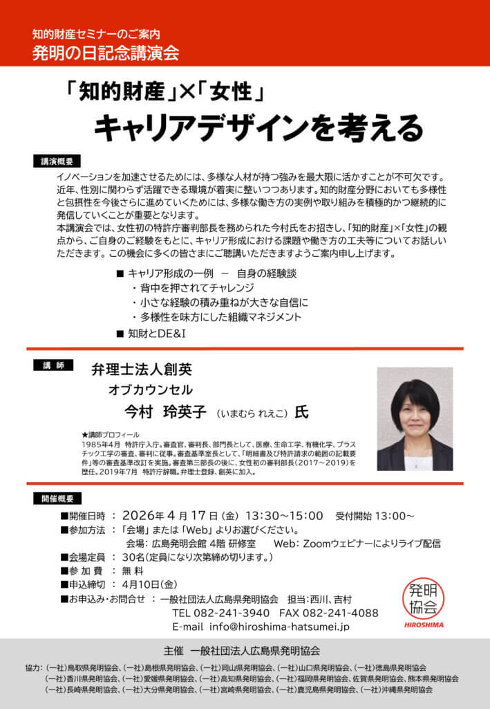 広島県発明協会総会記念講演会「知的財産」×「女性」キャリアデザインを考える』(4/17)