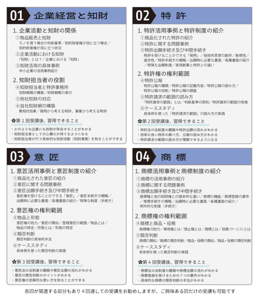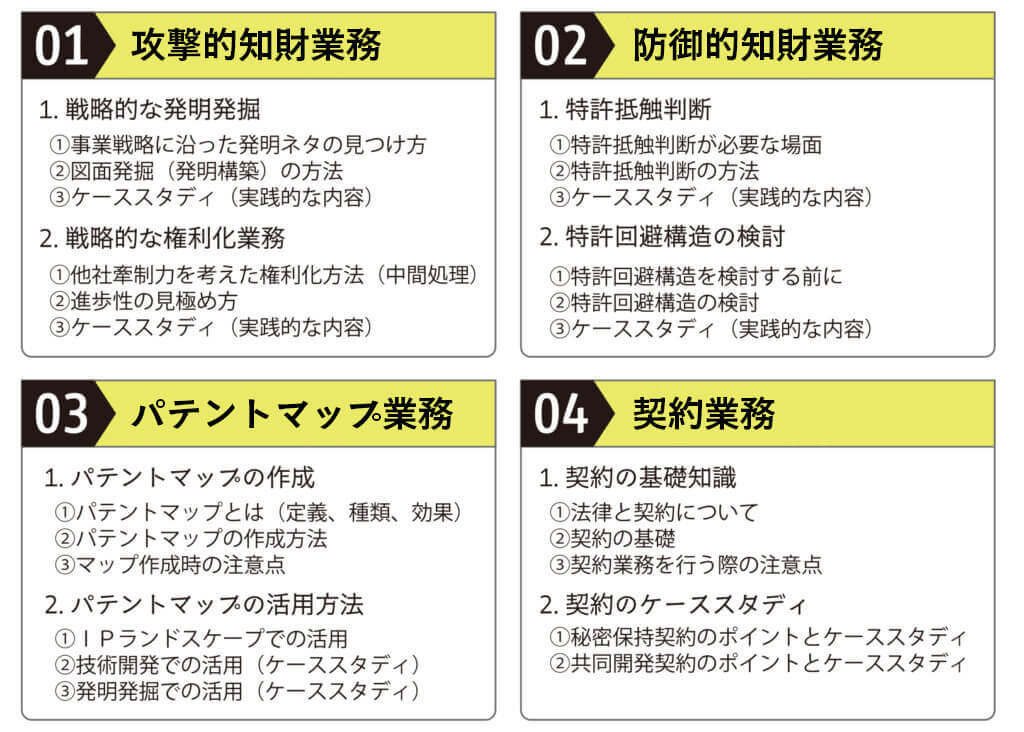 知財初心者を対象に、企業での知財活動の意味をご理解していただくと共に、優れた知財担当者等になっていただくため、重要なポイントに絞った内容を学びます。