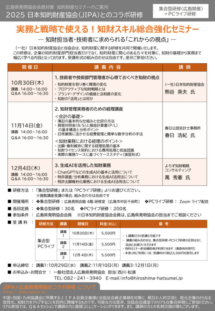 このセミナーは、日本知的財産協会(JIPA) とのコラボ研修で、中国・四国・九州協議会に所属するJIPA会員企業様と当協会会員企業様を対象に、相互の人的交流と、地元企業のさらなる活性化、知財力をアップすることを目的に開催するものです。可能な方は是非、当協会会議室でのリアルな集合研修にご参加ください。リアル参加では、Q&Aセッションで講師の方と直接コミュニケーションができます。また、講師の方との名刺交換の場もございます。