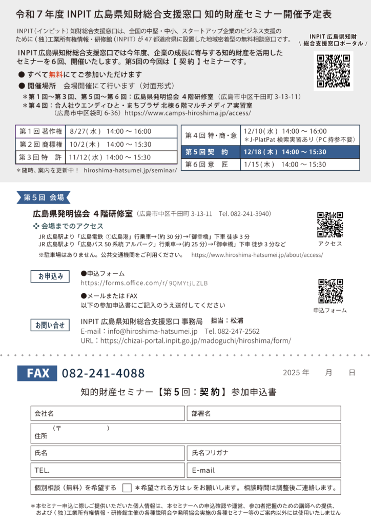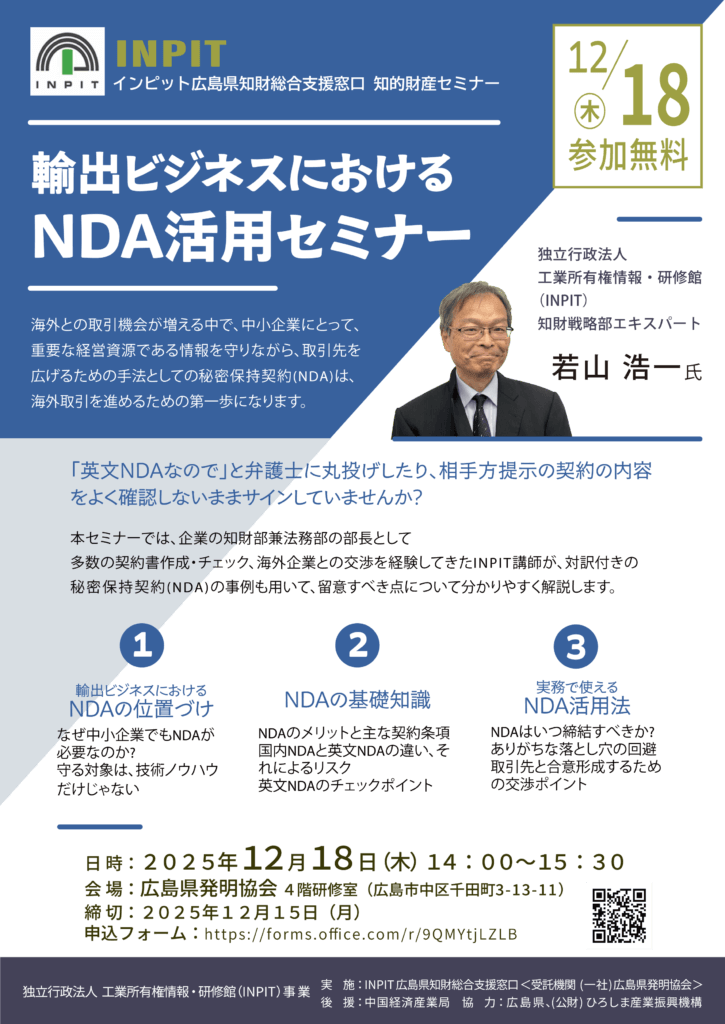 INPIT(インピット)広島県知財総合支援窓口 知的財産無料セミナー〔第5回〕